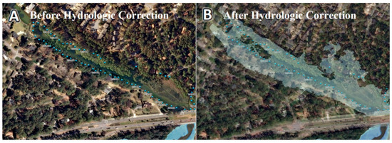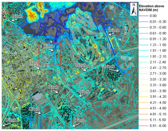 Examples of obtaining aerial elevations from lidar and conducting hydro-correction to assure unobstructed ditch and creek channels persist for hydrologic transport of king tide inundation in the City of Hampton, VA. Red highlighted boxes correspond to areas depicted in Figure 12A,B.