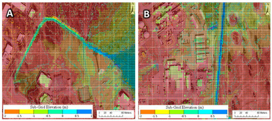 Conceptualization of macro-roughness features in an urban environment resolved within the street level inundation forecasts. In the example shown in (A), a bridge artificially obstructs flow from passing through to the hydrodynamic model grid cell below the one shown. With hydrologic correction provided by the citizen scientists via Catch the King (B) shows the grid opened, where a nearby flood contour can be extracted and applied to translate the inundation underneath the bridge and open flow to the opposite side, no longer impeding fluid flow.