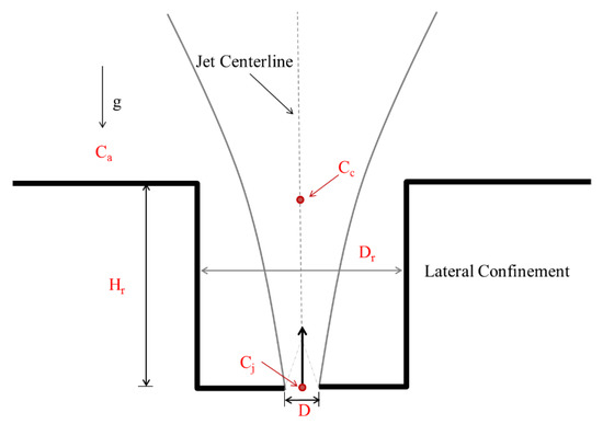 The geometrical parameters of lateral confinement, Dr/D and Hr/D, can be combined, and the combined parameter is referred to as the confinement index, β, which is defined by β = (Hr/D)/[(Dr/D)−1]. Therefore, the dimensionless jet centerline concentration can be expressed as: