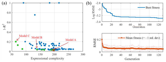 Figure 3b presents the fitness in each generation. It can be observed that the model performance was relatively poor at the beginning of the evolving process. However, the prediction errors quickly decreased with the increasing number of generations. The errors converged to acceptable magnitudes after about 20 generations. After approximately 30 generations, the improvement of model performance with the number of generations became insignificant, indicating that a better outcome could not be expected by performing the MGGP for more generations, and thus the current number of generations was sufficient.
