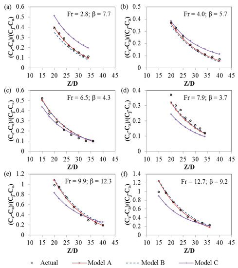Actual and predicted concentration profiles: (a) Fr = 2.8; β = 7.7; (b) Fr = 4.0; β = 5.7; (c) Fr = 6.5; β = 4.3; (d) Fr = 7.9; β = 3.7; (e) Fr = 9.9; β = 12.3; and (f) Fr = 12.7; β = 9.2.