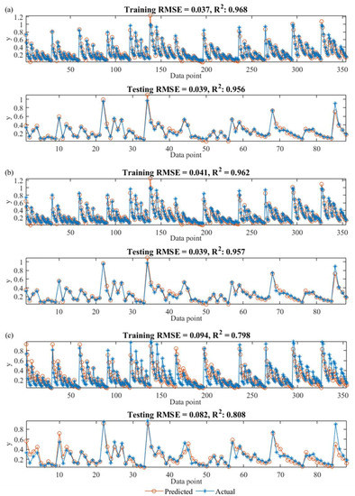 Comparison of actual and MGGP results: (a) Model A; (b) Model B; and (c) Model C.