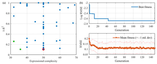 Figure 3a illustrates the performance-complexity trade-off of the evolved MGGP models for dimensionless jet centerline concentration. Determining the best model needs to consider two conflicting objectives simultaneously: accuracy and simplicity. Therefore, the Pareto optimization method was utilized. The green circles in Figure 3a denote the non-dominated solutions (i.e., there exists no solution that is more accurate and less complex at the same time) and the corresponding evolved MGGP models are referred to as the Pareto-optimal models [27]. These models are regarded as optimal because a solution cannot improve the model performance without increasing the complexity, and vice versa.