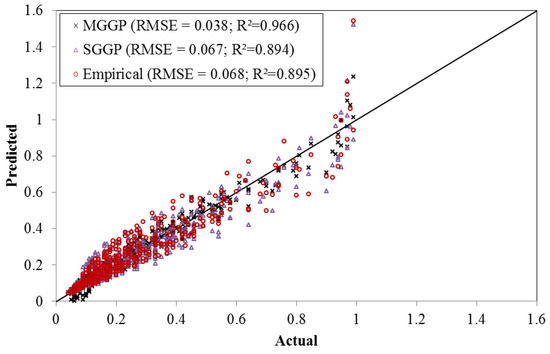 To evaluate further the evolved MGGP models, scatter plots of the actual and MGGP predicted results are presented in Figure 6.