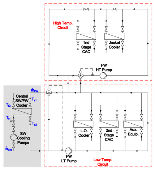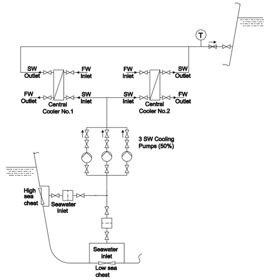 Typical ship cooling water systems consist of three parts: the seawater (SW) cooling system, the low-temperature (LT) freshwater (FW) cooling system and the high-temperature (HT) freshwater cooling system, as shown in Figure 1. In practice, according to the class requirements [7] the seawater system comprises several water pumps connected in parallel. Usually, two main pumps (one operating and one standby) are used; alternatively, three identical SW pumps are used provided that the two pumps can supply the cooling water flow rate required to cover the maximum flow rate scenario.
