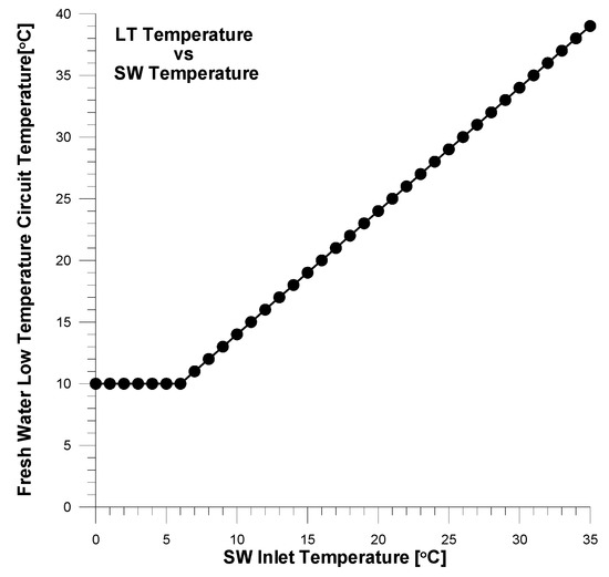 The LT freshwater cooling system usually consists of two (or three in some cases) pumps [7] to service the main engine (M/E) (scavenging air cooler, lubricating oil cooler and HT freshwater cooler) and the auxiliary machinery components (diesel-electric generator (D/G) sets, air compressor, etc.). The temperature of the freshwater entering the system coolers is controlled by a three-way valve, and in general there are two options: either the three-way valve is continuously adjusted to maintain the temperature level at 36 °C, varying the mass flow rate of FW entering the central cooler, or in case the auxiliary systems are capable of handling cooling water temperatures lower than 36 °C, the three-way valve keeps the heat exchanger by-pass line always closed, except only when the SW temperature is lower than 6 °C to ensure that the FW temperature at the heat exchanger outlet is higher than 10 °C (set-point) as shown in Figure 2 [9].