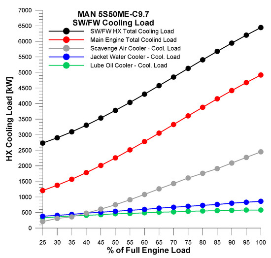 At full engine load the total cooling demand for the central cooling system equaled 6465 kW, which was equally divided to the two heat exchangers considered, i.e., 2 × 3233 kW. The cooling capacity of each HX considered was 4251 kW which is approximately a 30% over-dimensioning according to the usual practice followed in shipyards for safety reasons and to compensate for possible HX efficiency reductions due to fouling [21].