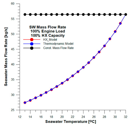 In Figure 6, the SW mass flow rate () is shown as a function of the SW inlet temperature (Tt1), when the variable speed drive (VSD) scheme is selected, compared to the conventional case where the pump speed remains constant. It is noticed that in the case of the VSD pump being used, two mass flow rates have been determined, i.e., one using a thermodynamic model (namely VSD-Thermodynamic Model) and another using the HX-model (namely VSD-HX Model). The first corresponds to the SW mass flow rate that would be determined using only the energy balance Equation (20), which is the most widely used approach for the techno-economic evaluation of the VSD control on the central cooling pumps, while the second is the SW mass flow rate determined by the proposed methodology in the current study, taking into account how the effectiveness of heat exchanger is affected by the variation of its boundary conditions (temperatures and mass flow rates). It is obvious that as the SW inlet temperature decreases, the required SW mass flow rate decreases too and is almost identical when calculated with either the conventional method (thermodynamic model) or the proposed one (HX-model). This is mainly attributed to the fact that the heat load examined is equal to the design heat load of the heat exchanger, and as will be presented later, this will not be the case at part-load conditions.