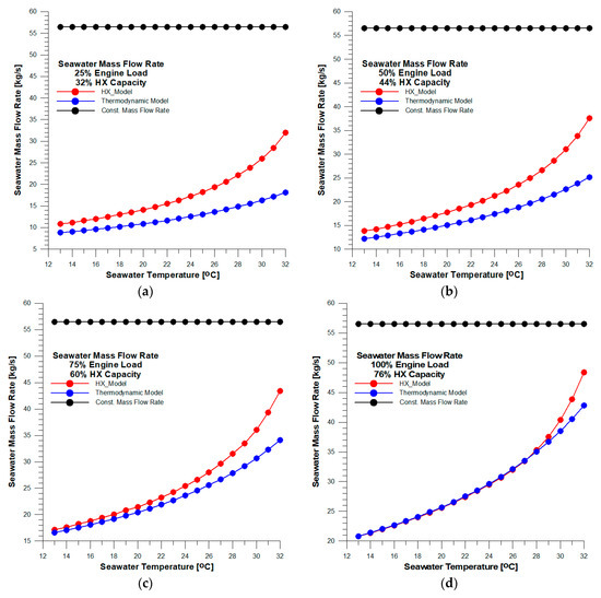 Comparison of seawater mass flow rates as a function of the SW inlet temperature (Tt1), for central cooler capacities corresponding to (a) 25%, (b) 50%, (c) 75% and (d) 100% of full engine load, with VSD scheme and constant pump speed.