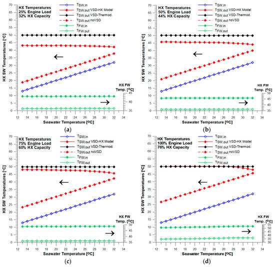 Overall, it can be concluded that through the proposed integrated approach the SW temperature range was identified for which the optimized operation of a VSD cooling pump can lead to serious annual fuel savings at various main engine loads. It should be noted that the results obtained under the current work correspond to a predefined control scheme for the VSD pump (maintaining the FW outlet temperature as close as possible to 36 °C and the SW outlet temperature lower than 50 °C); however, these parameters can also be adjusted using the proposed integrated approach to maximize the fuel savings attained at each operating condition (engine load, cooling load, ambient conditions) using a VSD cooling pump.