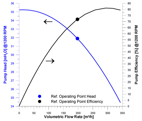 Among the most energy demanding auxiliary systems installed on a vessel, which operate almost continuously under variable conditions, is the seawater cooling pump. It is mandatory (based on the international regulations [7]) that SW pumps should be able to cover the maximum heat load of the cooling system under extreme (i.e., tropical) environmental conditions. This is a situation which rarely occurs in every-day operations. Therefore, a SW pump chosen to fulfill this requirement would operate most of the time at full capacity unduly [6]. In such cases, the recent trend is to promote the installation of variable speed drive (VSD) electric motors (when applicable) to operate pumps in partial loads when the cooling system duty is less demanding (sailing in cold seawaters or low engine loads) [8]. Considering that the electric power consumption of a pump is related to the pump volumetric flow rate according to affinity laws, the reduction of the pump speed (using the VSD motor) will affect the system pressure (head) to the power of two and the electric power consumption to the power of three as shown in Equation (1) [9]. It is therefore clear that even a small reduction of the SW pump volumetric flow rate (adjusted to the actual required capacity of the cooling system and the local environmental conditions), i.e., by 20%, would lower the pumping power required by approximately 49% based on Equation (1) [9]: