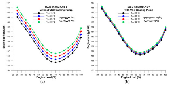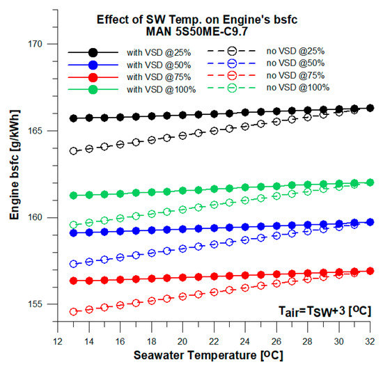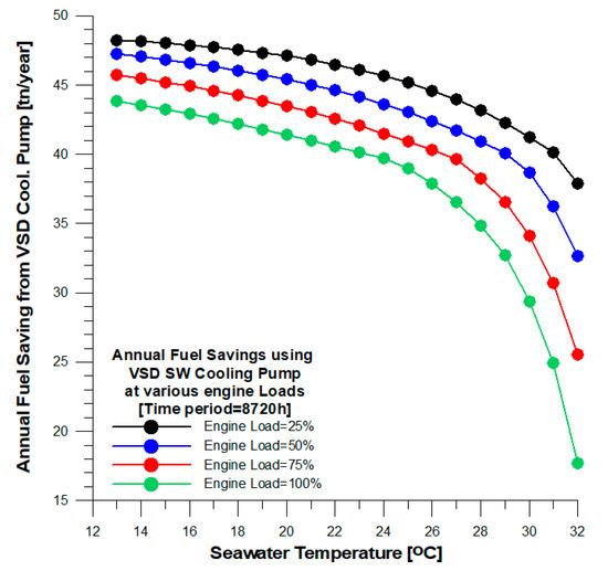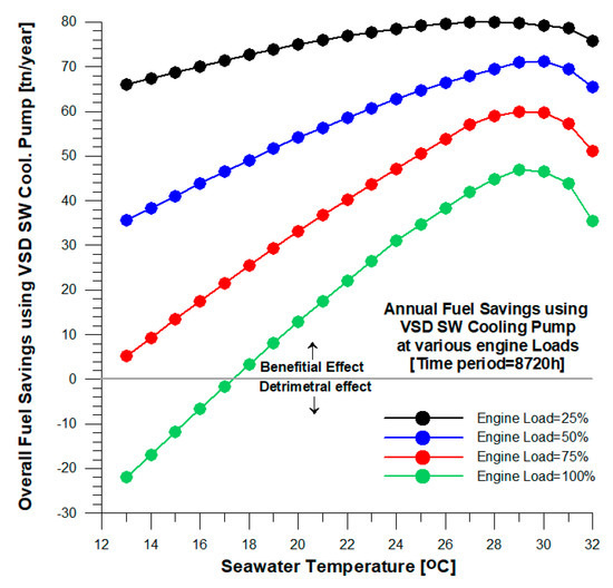 As observed, the higher benefit is achieved in lower engine loads, while at full engine load, there is a SW temperature threshold below which the usage of VSD SW cooling pump has a detrimental effect on the total fuel consumption of the main engine and the two cooling pumps. Specifically, at full engine load, when the seawater temperature is lower than 18 °C, it seems that the benefit of using a VSD diminishes, and below that value, using a VSD pump leads to increased fuel consumption compared to the conventional case (constant speed SW cooling pump). Moreover, from the parametric study conducted, it is obvious that at each engine load, the highest prospected benefit from using a VSD cooling pump is observed when the seawater temperature is around 29 °C, while as the seawater temperature decreases this positive effect is reduced.