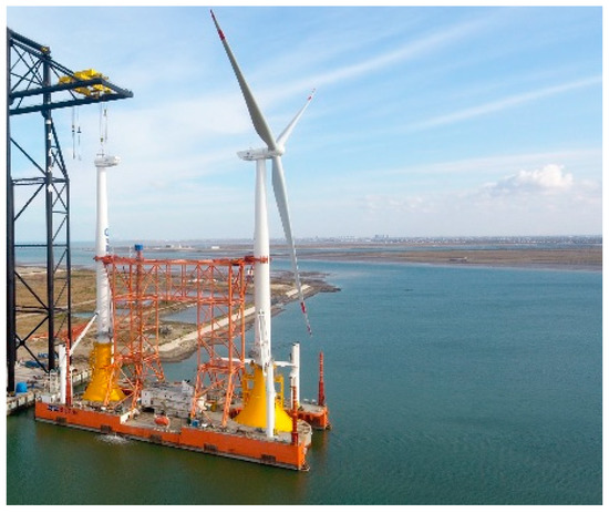The towing process has many factors, including the length of the towline; the stiffness, the location and form of the towline; the resistance and seakeeping of the tugboat, and the object being towed; and the motive power of the tug. The study of this technology began in 1950. Strandhagen et al. [15] used linear theory to study the interaction between the tugboat and the object being towed, and analyzed the effects of various towing factors on the vessel’s heading. Considering the particularity of the wind turbine structure, towing a turbine is different from towing a vessel. The structure of the wind turbine is very complex; it has many parts and its center of gravity is high, and it can be easily damaged. The construction of the conventional offshore wind turbine requires sinking the foundation or piling first, then hoisting the tower and turbine, and finally connecting the parts together. This method requires large vessels and lifting equipment. If the vessel, equipment, or construction method is not appropriate, it will easily lead to overturning or damage of the wind turbine structure, increasing the construction difficulty. That may have an important impact on the construction period and cost of the whole project [16,17,18].