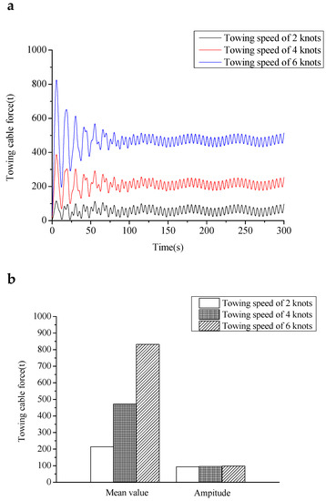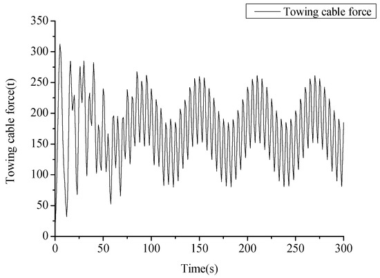 As the speed of the vessel increases, the mean value of the towing cable force increases significantly, from 50 t at a speed of 2 knots to 450 t at a speed of 6 knots, an increase of 800%, while the amplitude of the towline force oscillation is almost constant after stabilization at 75 t. The mean value of the towing cable increases in a square relationship with the towing speed of the vessel.