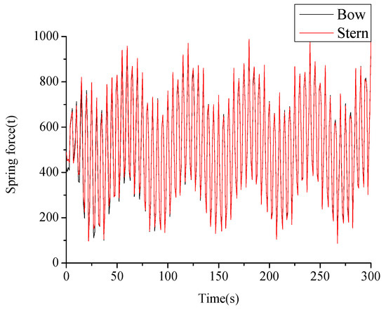 As can be seen from the Figure 7, Figure 8, Figure 9, Figure 10 and Figure 11, the towline force oscillated with the wave period. The oscillation was more severe at the beginning 0–50 s time course. The maximum value reached 300 t and the minimum value was 50 t, which led to the amplitude of 250 t. This was mainly because the unit model was applied for the working conditions at one time in the beginning of calculation. The model was suddenly subjected to the impact of water flow and wave, and the fluctuation phenomenon occurred as a start of towing. It took approximately 75–100 s to reach a relatively steady state for the unit model. After 100 s, the maximum towing force reached 250 t and the minimum value was 75 t. So the amplitude was 175 t and the mean value was 160 t. The spring force also oscillated with the wave period. The mean value of the spring force was about 500 t, which is consistent with the initial set value. The spring force oscillated around the initial set value with the maximum value of 900 t and the minimum of 100 t. The minimum value of the spring force was still always greater than zero, so the interaction between the wind turbine unit and the transportation and installation vessel was always pressure. The CBF and vessel were not separated from the movement. Under the working conditions, the wind turbine unit transportation model can work normally. The spring force time history curve of the turbine in the bow was almost the same as that in the stern; that is, the effect of the wave on the turbine in the bow and the stern was almost the same. The subsequent spring force is the resultant force of the three springs of the extracted bow as the basis for the analysis.