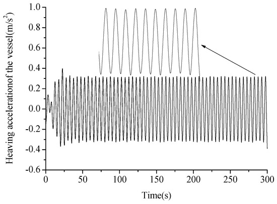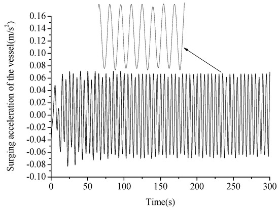 The peak of the heaving acceleration was the largest, about 0.4 m/s2; the second largest was the surging acceleration, which was about 0.08 m/s2. The pitching acceleration was not obvious, and it was zero in many time periods; the maximum value was only 0.02°/s2. It shows that the heaving oscillation movement of the vessel is dominant and the pitching motion is negligible.