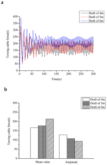 From the above analysis, it can be seen that as the draft increases, the magnitude of the towing cable force amplitude of the vessel has a slightly increased mean value. The amplitude of the spring force decreased significantly with the increased draft, and the heaving acceleration of the vessel was significantly reduced when the water is 6 m. Increasing the draft can significantly reduce the vertical oscillation of the vessel.
