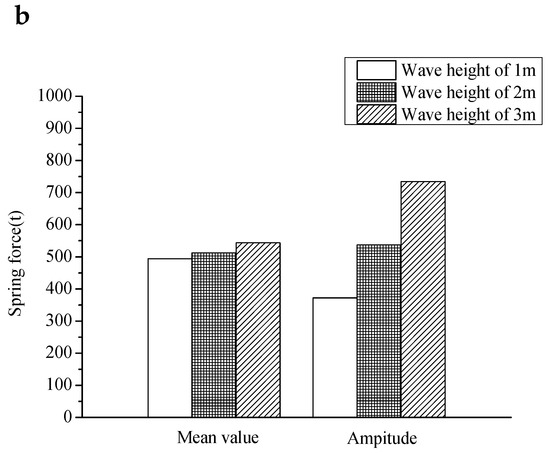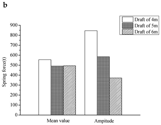 It can be seen that as the draft increased, the amplitude of the towing cable force oscillation during relatively steady motion decreased slightly, and the amplitude after relative stabilization was 100 t. The mean value of the towing cable force increased from 170 t for 4 m draft to 220 t for 6 m draft with an increase of about 30%. As the draft increased, the mean value of the spring force was almost constant, and it oscillated around 500 t, while the amplitude became significantly smaller from 850 t at 4 m draft to 350 t at 6 m draft with a decrease of about 59%. Under the conditions of each draft, the spring force was always greater than 0. It can be said that under those three conditions, the wind turbine and the one-step transport vessel were not separated in the time domain, ensuring integrated transportation.
