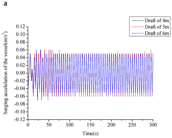 Comparative analyses of the longitudinal and heaving acceleration of the transportation and installation vessel with different draft conditions are shown in Figure 14.