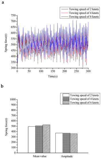 Comparative analyses of the model towing cable force and spring force under different towing speed conditions are shown in Figure 15 and Figure 16.