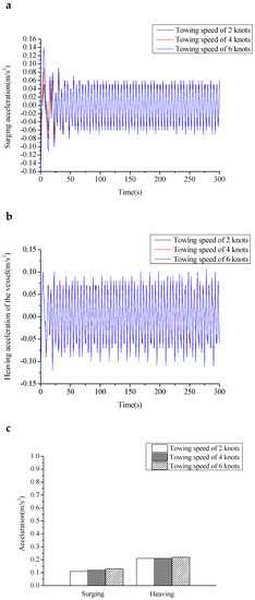 Comparative analyses of the surging and heaving acceleration of the one-step integrated transportation and installation vessel under different towing speed conditions are shown in Figure 17.