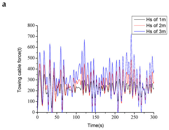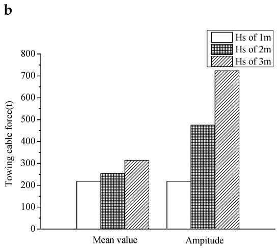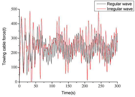 It can be seen that for regular and irregular waves, as the wave height increased, the mean value of the towing cable force increased slightly, while the amplitude of the towing cable force oscillation increased almost in multiples. For regular waves, the towing cable force increased from 130 t at 1 m wave height to 400 t at 3 m wave height, and for irregular waves from 250 t at 1 m wave height to 700 t at 3 m wave height, an increase of 200%. The towing cable force oscillated more irregularly with irregular waves at the same height. The mean value was almost constant and the amplitude of the oscillation was significantly larger.