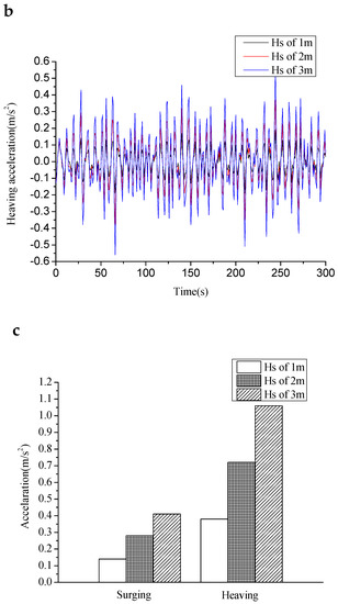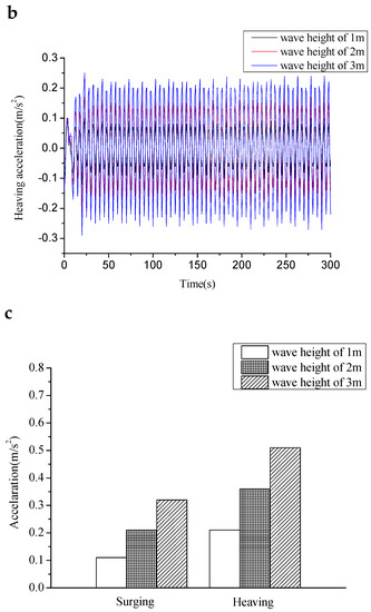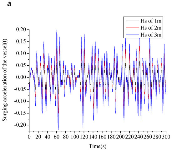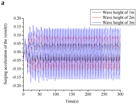 Contrasting analyses of the surging and heaving acceleration of the transportation and installation vessel under different wave height conditions are shown in Figure 25, Figure 26 and Figure 27.