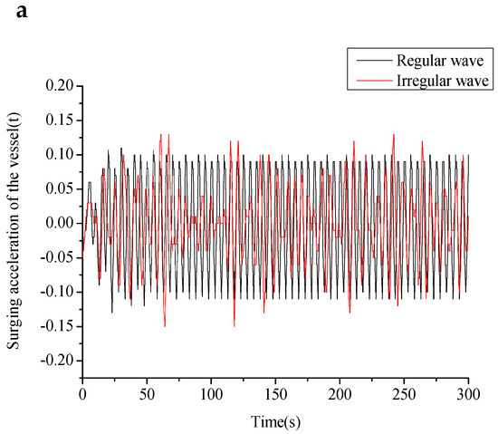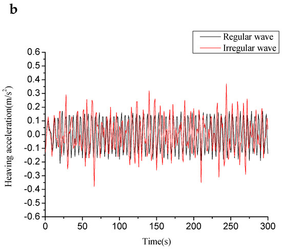 Comparison of acceleration between regular and irregular waves with 2 m wave height. (a) Surging acceleration time history; (b) heaving acceleration time history.