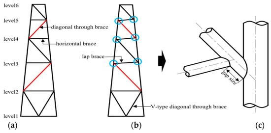 Configurations of the traditional and eccentric jacket substructure. (a) Traditional jacket substructure; (b) Eccentric jacket substructure; (c) Completely overlapped joint.
