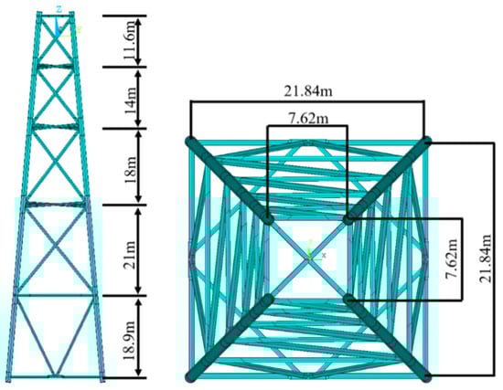 As depicted in Figure 2, the overall height of the jacket substructure measuring from the horizontal framing at the base (level 1) to that at the top is 83.5 m. The elevation of levels 2 to 5 was 18.9 m, 39.9 m, 57.9 m, and 71.9 m, respectively. The jacket was a four-leg substructure of equal spacing of width 21.84 m, and 7.62 m for the base and the top horizontal framing, respectively. The diameter and wall thickness of the members are listed in Table 1. The Young’s modulus and the Poisson ratio were set to 2.06E11 N/mm2 and 0.30, respectively.