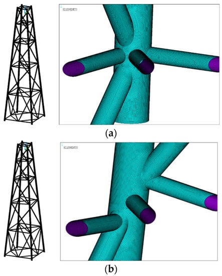 FE models of jacket substructures. (a)Traditional jacket substructure with K/T-type joint; (b) Eccentric jacket substructure with completely overlapped joint.