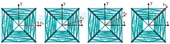 The base of the four legs of the jacket substructure was assumed pinned. To simulate the actual condition on -ite, the weights of the topside structure and equipment acting at the top level of the jacket substructure were applied as vertical downward loads FZ. The horizontal environment loads were simplified as static loads FH and were applied horizontally at the top level of the jacket legs. The applied vertical and horizontal loads, FZ and FH acting on each jacket leg were 1, 350 kN, and 135 kN, respectively. In view of the rotation symmetry of the jacket substructure, the horizontal load was applied at four different horizontal angles at 0, 15, 30, and 45 degrees, as illustrated in Figure 4. There were four combined load cases of FZ and FH, namely load cases #1 to #4, in 0, 15, 30, and 45-degree directions, respectively.