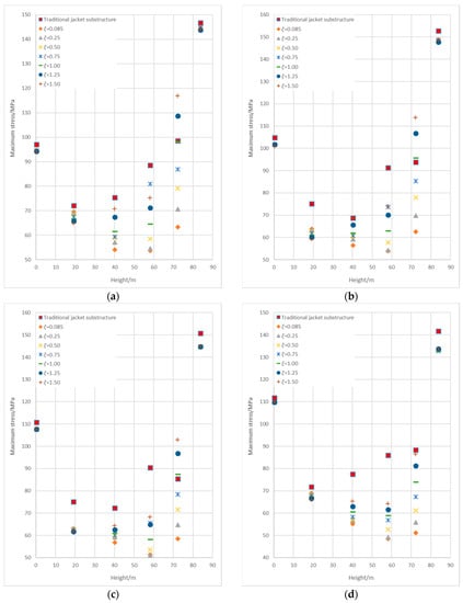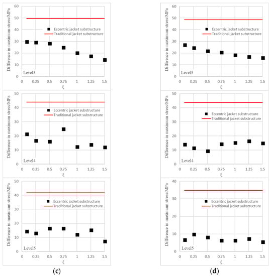 Comparison of the maximum difference of stresses between eccentric and traditional jacket substructure. (a) Load cases #1; (b) Load cases #2; (c) Load cases #3; (d) Load cases #4.