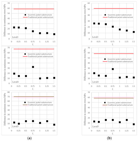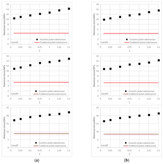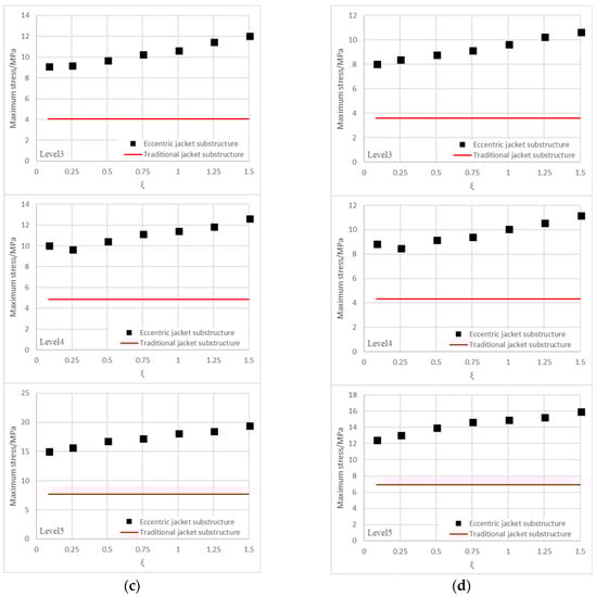 The study on the effect of the gap size of the short segment of the through-brace joining the chord face revealed that the maximum stresses at levels 3 to 5 increase dwith ξ. As shown in Figure 5a,b, the maximum stress at level 5 of the eccentric jacket substructure was higher than that of the traditional jacket substructure when ξ was greater than 1. It could, therefore, be commented from the results that the dimensionless parameter ξ should be controlled with a gap size not greater than the through-brace diameter for better ultimate strength at the joint.
