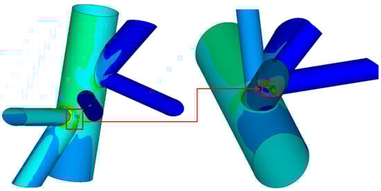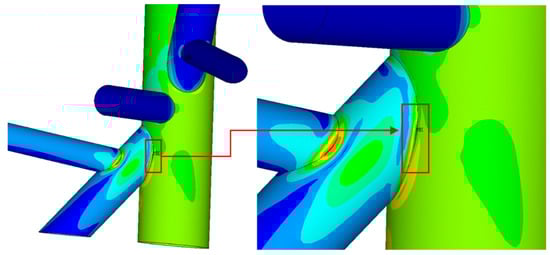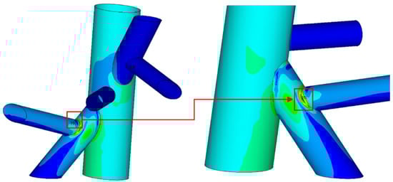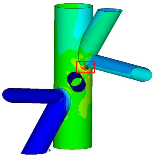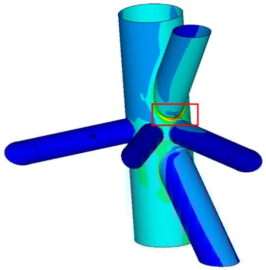 The high-stress critical areas of the two jacket substructures occurred at different locations. For the traditional jacket, it was located on the chord face of the legs at the gap intersection between the two braces, as shown in Figure 8. On the other hand, for the eccentric jacket substructure with minimum ξ (0.085 with gap size of 51 mm) at the joint, there were three possible locations of high-stress area on the chord face of the jacket legs (similar to that of the traditional jacket substructure), the short segment of the diagonal through-brace or the end of the diagonal brace joining the chord face, as depicted in Figure 9, Figure 10, Figure 11 and Figure 12, respectively. However, most of the high stress area of the joints of the eccentric jacket substructure occurred at the short segment of the diagonal through brace joining the chord face.