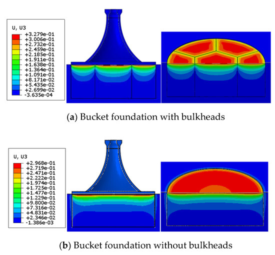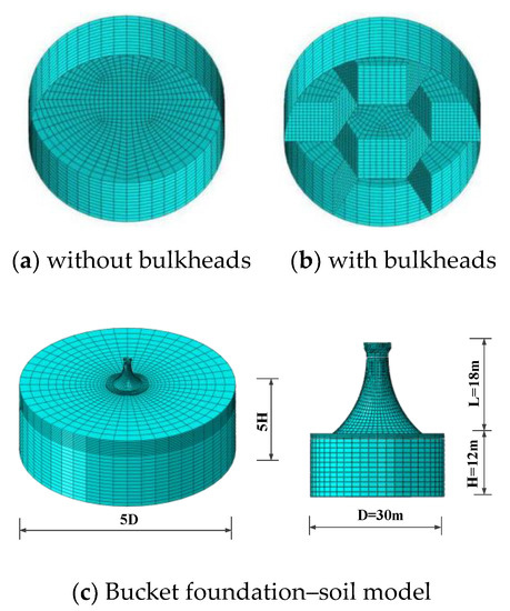 In order to obtain a clear indication of the improvement effect of the vacuum preloading method, a three-dimensional finite element model of the bucket foundations with and without bulkheads is established using the universal finite element analysis software ABAQUS, as shown in