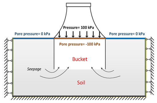 The step of soils is established after balancing the ground stress. Though the suction can be created theoretically as 200 kPa with 10 m water depth, considering soil profile, water gradient loss and pump capacity, the difference of water head applied in real engineering was just approximately 10 m. So the boundary conditions of the pore water pressure at the surface soil inside and outside the foundation are set as 100 kPa and 0 kPa respectively, which mean the underpressure of the top lid is 10 m water head and initial pore water pressure is −100 kPa inside the bucket. It uses the difference of water pressure to impose the load on the soil, resulting in excessive pore water pressure. As the pore water is extracted from the top of the bucket, the excessive pore water pressure turns into soil effective stress due to dewatering, so the soil is reinforced. Horizontal displacement is prevented at the side boundaries of the soil, and at the bottom boundary, the vertical, horizontal and rotational displacements are all fixed. The contact pair algorithm in the ABAQUS is employed to simulate the contact features of the interface between the foundation and the soil, with a friction coefficient of 0.5. This takes a total of twenty days. The load and boundary conditions of the finite element model are illustrated in