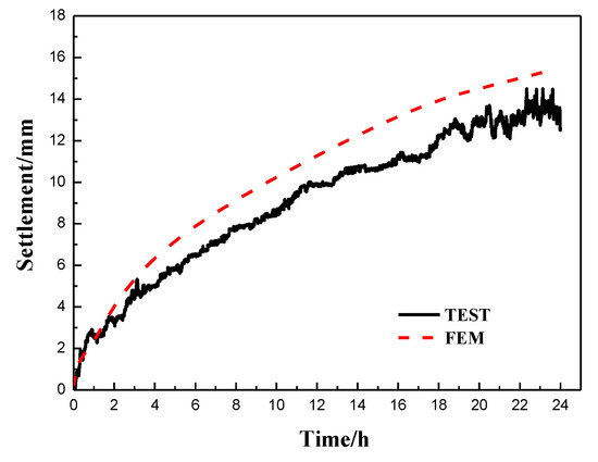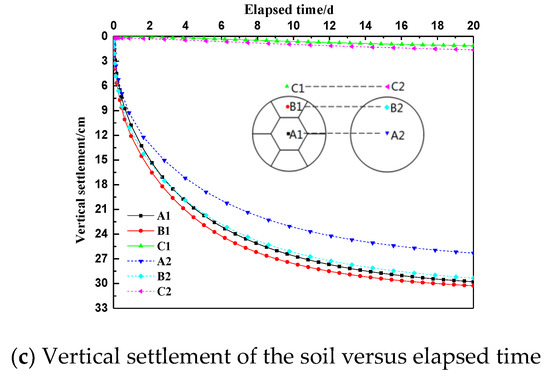 Figure 3a,b, where the maximal values are 32.79 cm and 29.68 cm, respectively, at the surface soil in the reinforced area. Comparisons of the vertical settlement curves changing with time at different positions are shown in