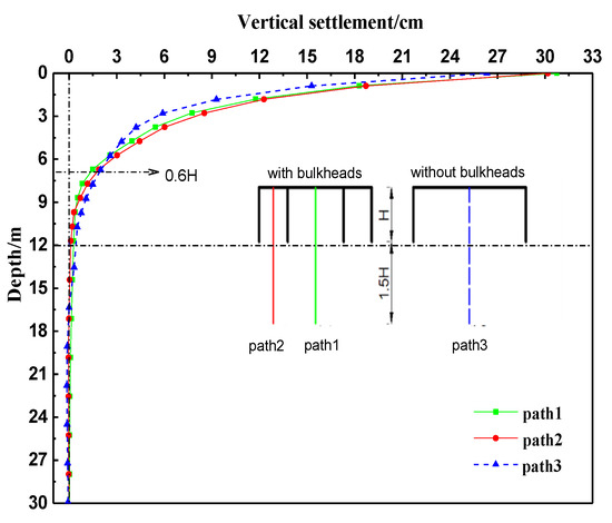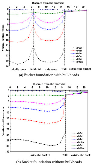 Figure 6 shows the vertical settlements with distance from the centre at different depths. The curves of the bucket foundation without bulkheads are more gentle and uniform. Below the depth of 0.6 H, the settlement of the soil is less than 3 cm and there is little settlement at the depth of H. It indicates that the vacuum pressure has little effect on the soil below the depth of 0.6 H. Furthermore, the soil settlement inside the bucket foundation with bulkheads is 3 cm larger than that without bulkheads within 0.6 H depth. Each room in the foundation with bulkheads can be considered as an independent section. The settlement increases first and then decreases from the centre to the edge in the reinforced area. The minimum value occurs near the bulkheads. Due to the shrinkage of the soil induced by vacuum preloading, the central soil is the densest and the void ratio is the lowest. From the centre to the edge of the reinforced area, the soil gradually approaches the vertical drainage channels around the bucket wall and the bulkheads. Consequently, settlement increases as seepage path decreases. The adhesion and friction between bucket walls and the soil hinders the settlement and the value decreases.
