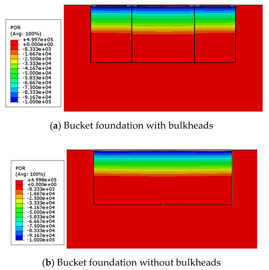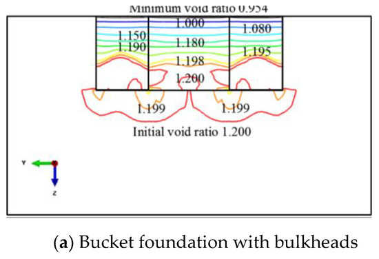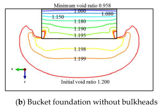 (3) The variations of the soil void ratio decrease with increase in depth. In shallow soil, the void ratio for the bucket foundation with bulkheads decreases more and the consolidation effect is better than that in deep soil. In the foundation without bulkheads, there is a larger region of soil depth that shows improvement effect.