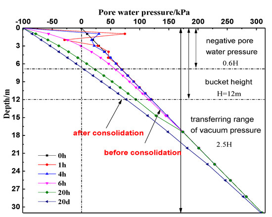 Figure 9. In the first few hours, the soil shows the Mandel effect as the pore water pressure rises and exceeds the initial value, so the curve fluctuates locally. The pore water pressure changes regularly and decreases steadily with time passes after 6-h reinforcement. It is clearly observed that the decrease in pore water pressure slows with the increase both of the time and the soil depth. This indicates that the vacuum pressure decreases over the diffusion process: the greater the time and the soil depth, the greater the loss. The final pore water pressure tends towards stability with the continuous consolidation of the soil. When comparing the pore water pressure curve before and after consolidation, it can be concluded that the vacuum pressure diffuses to considerable depth and it is up to a depth of 2.5 h that the pore water pressure changes to varying degrees. The change in pore water pressure decreases with increase in soil depth. The pore water is pumped out and the excess pore water pressure dissipates, so the pressure borne by the pore water is gradually transferred to the soil skeleton leading to an increase in the soil effective stress. The difference between the pore water pressure before and after the consolidation is the added value of the soil effective stress. Therefore, the dissipation process of the excess pore water pressure essentially reflects the reinforcement process of the soil.