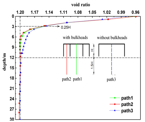 (4) The pore water pressure of the foundation with the bulkheads is higher than that without the subdivision at the same level and therefore the bulkheads contributes to the transfer of pore water pressure. This is conducive to the improvement of shallow soil. Along with the increase in consolidation time, pore water in shallow soil is extracted from the foundation, gradually decreasing the void ratio and increasing the soil density. The seepage channels in deeper soil are more restricted, with a reduced drainage rate and reinforcement effect.