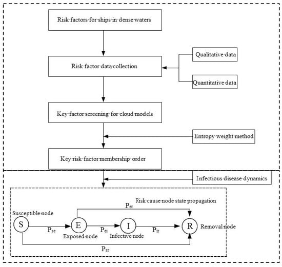 In the second step, the transmission of key risk factors of the ship navigation system was described by using the infectious disease dynamics method. The construction of the model is as follows: Firstly, the membership sequence of risk index was substituted. Based on that, susceptible node, exposed node, infective node, and removal node were introduced into the analysis process of risk causes transmission according to the dynamic mechanism of infectious diseases. Finally, the risk causes transmission analysis model was constructed.
