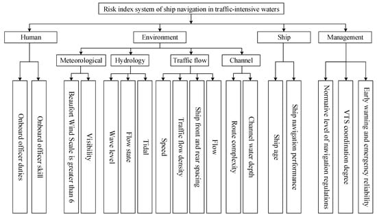 According to Table 1, the human factors include onboard officer duties and officer skills. The environmental factors include meteorology, hydrology, navigation channel, and traffic flow. Among them, meteorological factors include Beaufort wind scale of greater than or equal to 6 and visibility; traffic flow factors include speed, traffic flow density, ship front and back spacing, and flow rate; hydrological factors include wave class, fluid state, and tide; the channel factors include route complexity and channel water depth. The ship factors include ship age and ship navigation performance. The management factors include normative level of navigation regulations, VTS (vessel traffic service) coordination degree, early warning, and emergency reliability. Finally, the risk index system of ship navigation in traffic-intensive waters is established, as shown in Figure 2.
