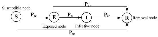 Based on the infectious disease dynamics model, the risk causal nodes of ship navigation were divided into four categories: susceptible node (S), exposed node (E), infective node (I), and removal node (R) [61]. Four types of nodes were determined according to the degree of influence of risk factors in the process of risk dynamics propagation of ship navigation. As a property of the risk state, the risk causal node can map the risk factor into the node in the risk cause analysis process. The nodes are classified according to the nature of the identified key risk factors, and analyzed by using the infectious disease dynamics theory. General risk factors in traffic-intensive waters have the characteristics of easy infection, which can transmit the risk of infection to adjacent exposed nodes; if the risk continue developing, the risk of a navigation system will change from the state of the exposed nodes to infective nodes; however, if the risk is prevented from spreading, the navigation risk will be directly changed from the exposed state to the immune state. In the propagation process of navigation risks, if a removal node is encountered, the risk becomes immune with a probability.
