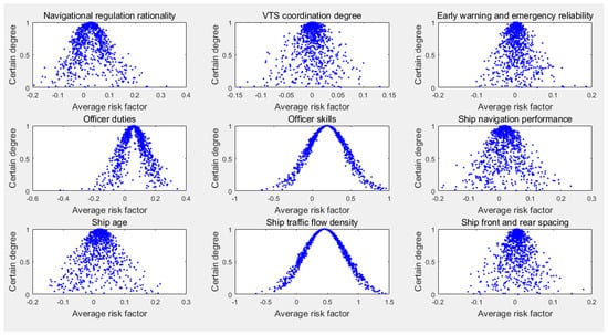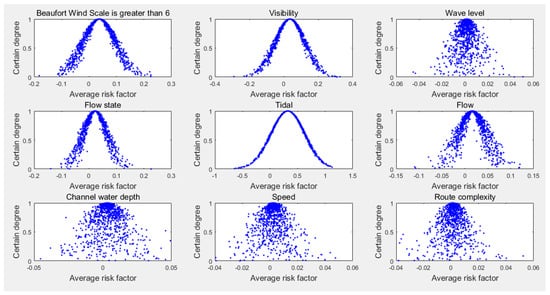 It can be seen from Table 6 that the values of of the ship traffic flow density, tide, onboard officer skill, onboard officer duties, Beaufort wind scale of 6 or greater, and poor visibility are high. It is noted that the higher the , the greater the degree of risk. When a ship is sailing in this area, the degree of risk caused by the traffic density of the ships is the highest, the tide factor is the second, the onboard officer skill is the third, the onboard officer duties is the fourth, the Beaufort wind scale of 6 or greater, and the poor visibility are fifth.