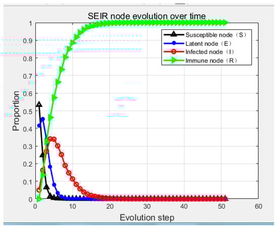 According to the above-mentioned ranking of risk factors of ship navigation, the risk causal propagation process of the infectious disease dynamics model was simulated to verify the influence of key nodes. Through the screening of key risk factors, onboard officer duties and officer skill were summarized as human error; Beaufort wind scale of greater than or equal to 6 and visibility were summarized as bad weather. In the case where the model parameter coefficient α is set as 10, the above risk causal analysis model was used to describe the risk propagation of nodes, such as ship traffic flow density, tide, human error, and bad weather. According to the characteristics of the selected key influencing factors, combined with the principle of SEIR, the susceptible node (S) was expressed as the most vulnerable factor to receive the risk mutation, which can be mapped to the ship traffic flow density in this paper. The exposed node (E) was expressed as a risk factor which can receive a sudden change in risk but not transmit the risk. Due to the fact that the traffic control will be made by the maritime department under the large tidal range in the Yangtze River estuary, the exposed node can be mapped to the tide. The infective node (I) was expressed as a risk factor that transmits the risk, which can be mapped to the bad weather in this paper. The removal node (R) was expressed as the risk factor, which can receive risk and stop transmitting risk. Due to the fact that the removal node has a large subjective initiative, it can be mapped as human errors.