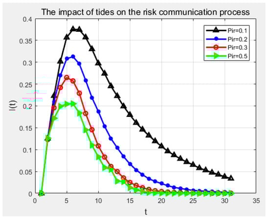 Assume that the degree of the tidal node Pir was 0.1, 0.2, 0.3, 0.5. The change of the risk propagation process under different tidal conditions was studied, as shown in Figure 8. As the probability of the tides increased, the density of the degree of the propagation node gradually decreased, eventually reaching zero. This is mainly due to the fact that after the occurrence of the tide, the vulnerable nodes of the ship navigation do not enter the risk propagation state. Instead, it directly converted to the removal node state.
