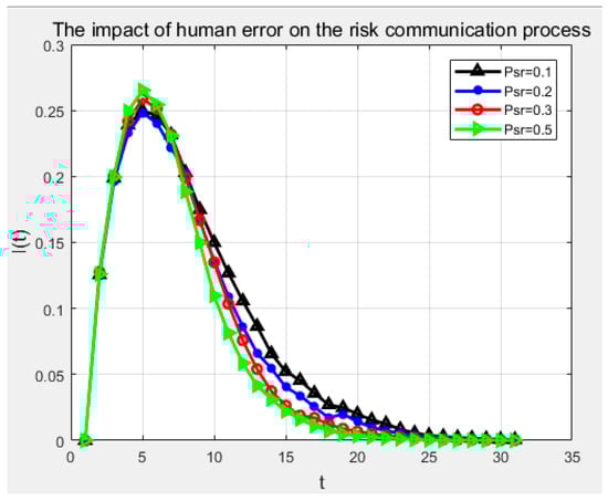 Assume that the degree of human error Psr was 0.1, 0.2, 0.3, 0.5. The change of risk propagation process under different probability of human error was studied, as shown in Figure 9. When the probability of human error increased, the peak value of the removal node increased slowly. Due to the increasing density of removal nodes, the navigational risk related to human errors did not continue spreading, resulting in an increased probability of conversion to immune status.
