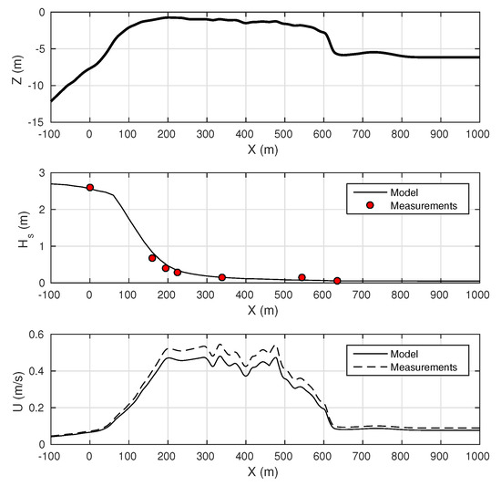 A first validation study is carried out on a purely cross-shore configuration of the model. The main aim is to check the ability of the numerical model to represent the depth-averaged momentum balance along a barrier reef. In particular, it is of primary importance to determine the performance of the model in the description of wave breaking above the reef and the consequent production of cross-reef current induced by wave-induced pressure gradient. The validation data has been recovered during a dedicated in situ experimental campaign on the Ouano reef, New Caledonia. This site has been selected for benchmarking in the present study because it is a large channel lagoon where waves are by far the main driver of the reef hydrodynamics. This means that, on the barrier reef, the tide effect and the lagoon boundaries can be neglected as soon as the waves are large enough to break [45]. The deployed instrumentation and the field site are presented in details in Sous et al. [29]. The complete numerical domain is 2500 m long, ranging from to 2000 m with a 5 m uniform resolution (X is the cross-shore abscissa). A zoomed view of the bathymetric profile is given in Figure 1, upper plot, the open ocean and lagoon being on left and right sides, respectively. The numerical simulations are forced with reef-normal wave conditions encountered on 29 May 2016 at 15:40. Deep water significant wave height and period are 2.44 m and 11.4 s. Still water level is imposed at 0.53 m according to the measurements performed outside the wave action zone [29]. The only calibrating parameters are the wave and mean current friction coefficients. They are imposed at 0.5 and 0.03, respectively, in order to mimic the high roughness of coral reefs [34].